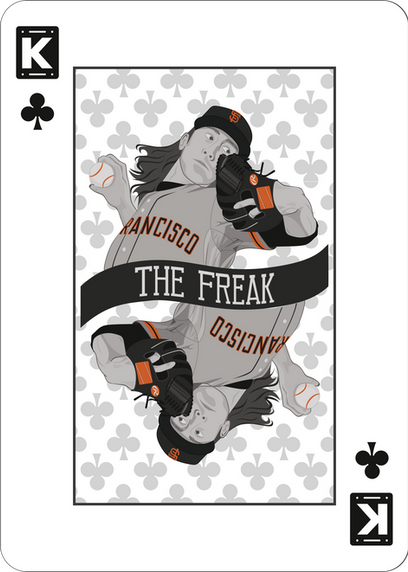 Kings of the Hill was a set of four playing cards I designed for the 2nd Annual Battle of the Bay Art Show, hosted by the San Francisco Giants and Oakland Athletics, to showcase the work of local artists and fans of the team. The set is comprised of four kings, one of each suit, and features an original illustration of a prominent San Francisco Giants pitcher from the past decade. The shape of the letter K represents "K Ville," a part of Oracle Park that keeps track of how many strikes Giants pitchers have thrown. I also designed a back for the cards that reimagines the classic Bicycle card back with a baseball theme.